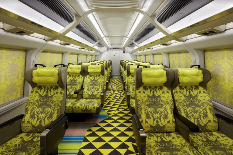 Light and speed are underscored by bursts of neon yellow in the reserved seating car designed by Nao Matsumoto, while, by contrast, the train’s café car transports you to the ancient highway of the Mikuni Kaidō. Enjoy a cup of the popular Tsubame Coffee from Tsubame-Sanjo as you relax in this rustic café designed by Kentaro Kobuke.