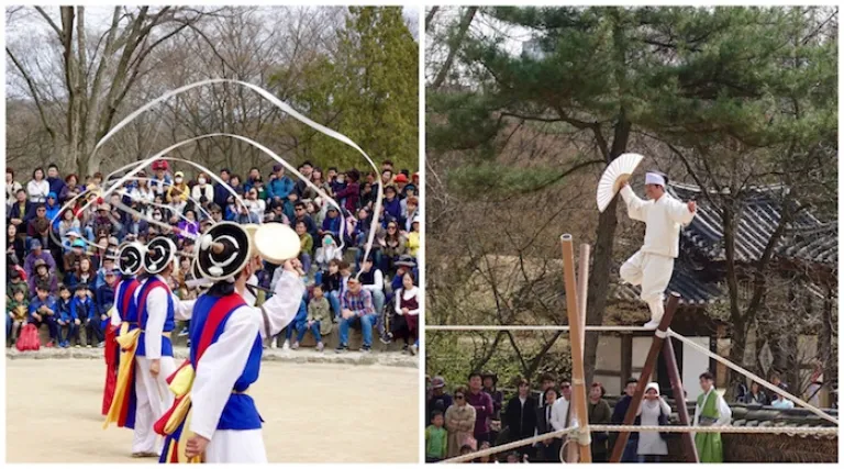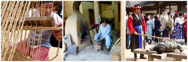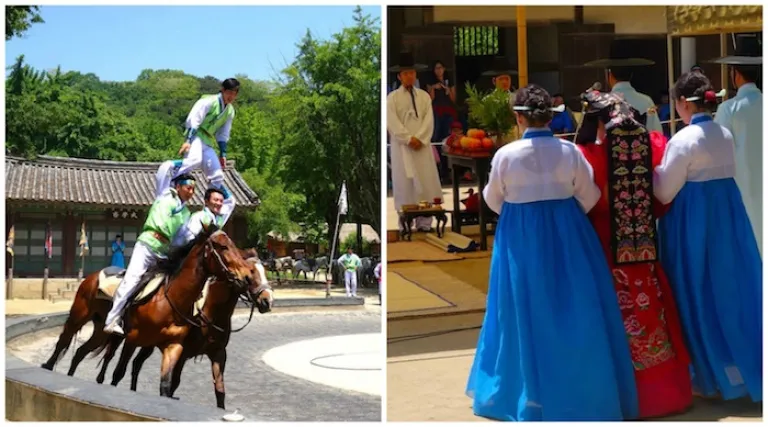 The highlight of visiting the Korean Folk Village would be the traditional art performances. These are held throughout the day, so do check the schedule the minute you enter the park so that you can catch them all. Choose from (left to right) a Farmer’s Music and Dance performance, Acrobatics on a tightrope, daring Equestrian feats as well as a traditional Korean Wedding Ceremony.