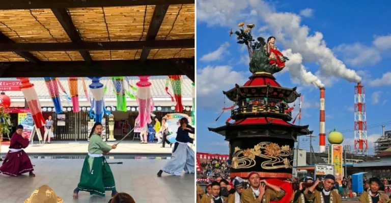 Samurai live demonstration (left); Float parade at Yatsushiro Myoken Festival (right) | Image credit (L-R): Kumamoto Tourism Board Official Website; Kumamoto Japan Tourism Official Facebook Page