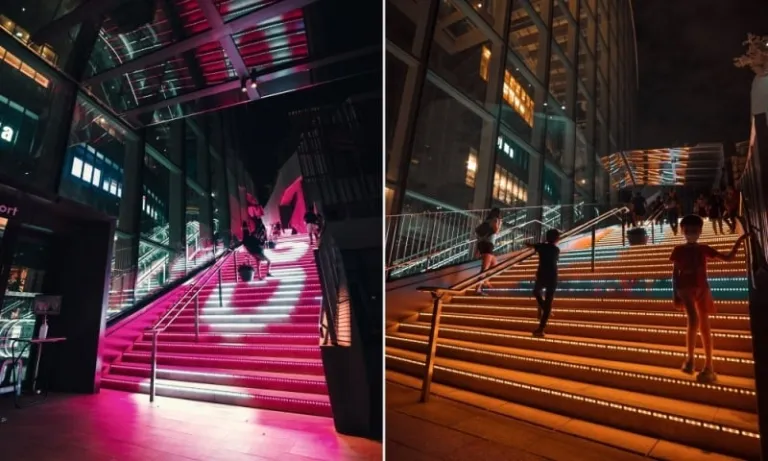 The first thing you see when you enter Lalaport is the large glass exterior, and then a staircase next to it where you can walk all the way up to the fourth floor (the rooftop). The staircase is known for its illuminating LED lights. While they are on throughout the day, they are at their brightest at night!