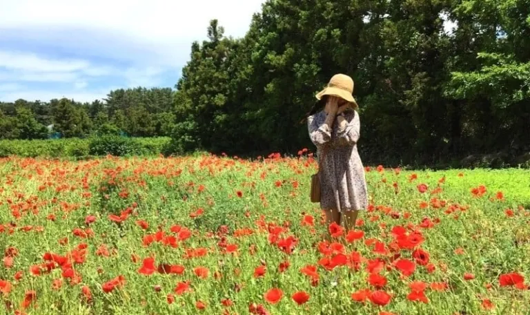 Ayra Lee standing in a field of red poppies on Jeju Island. | Image credit: Ayra Lee