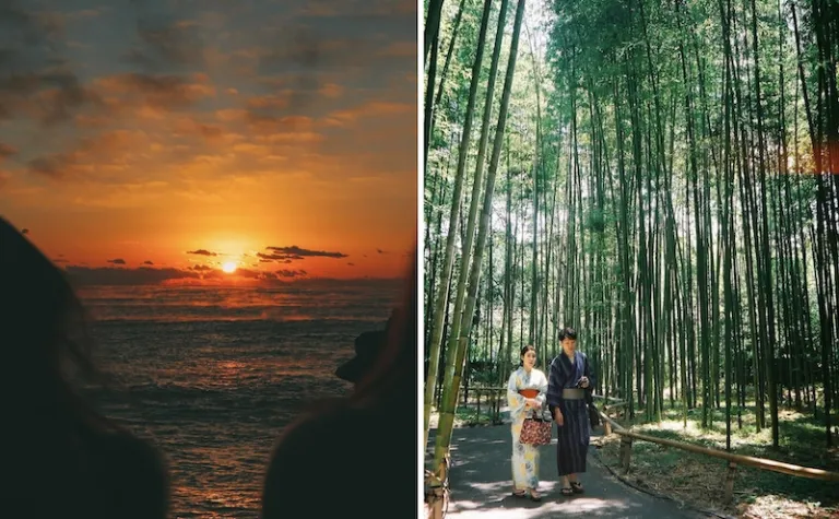 (L-R): Catching the first sunrise of 2019 in Ibaraki Prefecture; A couple strolling along Kyoto’s Sagano Bamboo Forest