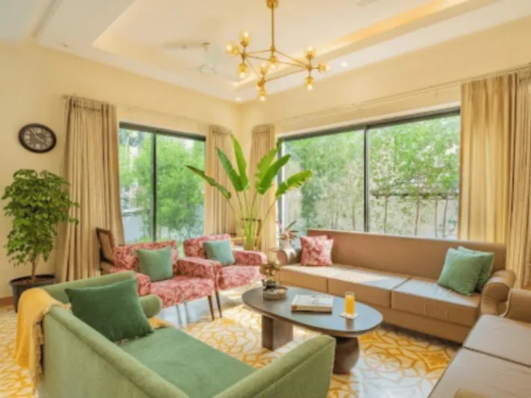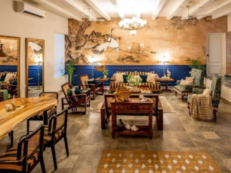 Tucked away in Siolim, YashGeet Villa is an experience wrapped in luxury. Designed to turn heads and steal hearts, this luxe 4-BHK villa features a living room with floor-to-ceiling windows, opulent chandeliers, and a semi-circular sofa that screams ‘lounge goals.’