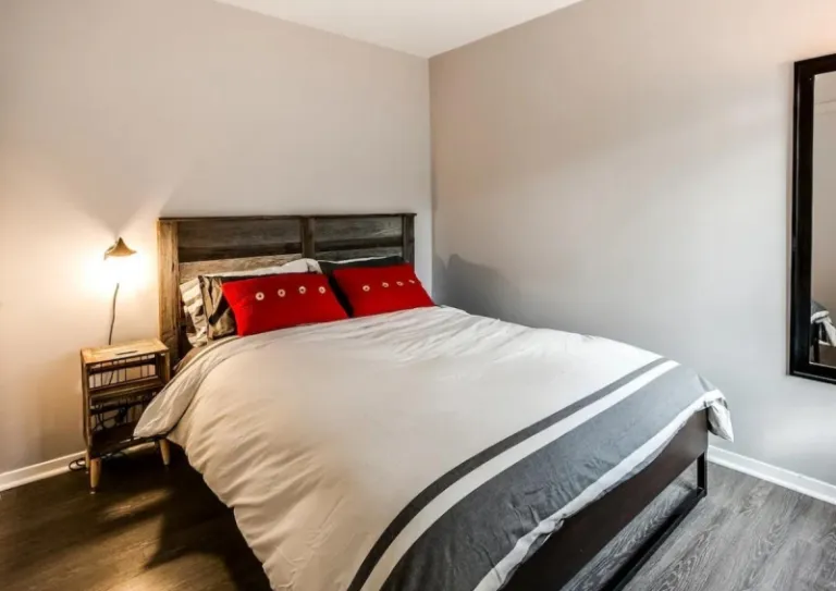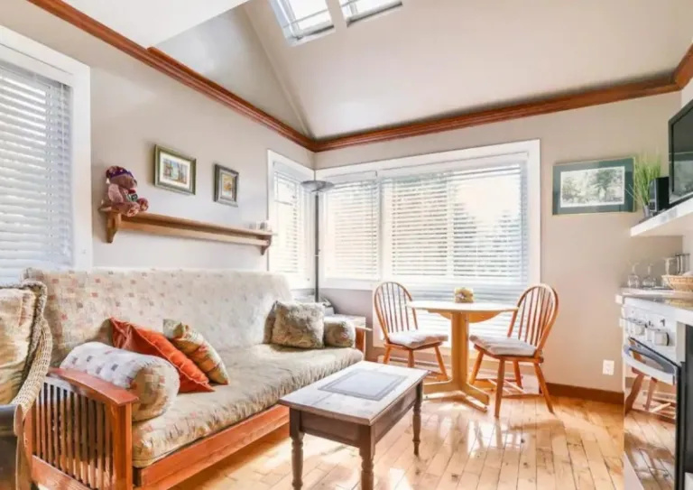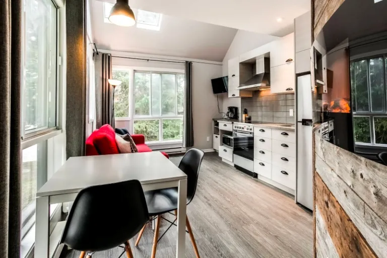 Merging a neutral palette with bold patches of red is this refined Mont Tremblant Airbnb with a hospitable spirit. This 320-square-foot condo can comfortably accommodate a couple or a family of four looking for a cosy ski-in/ski-out home in Tremblant. FYI, this property nestles at a foothill area, and right in front of it is a serene river that adds charm to the stay.