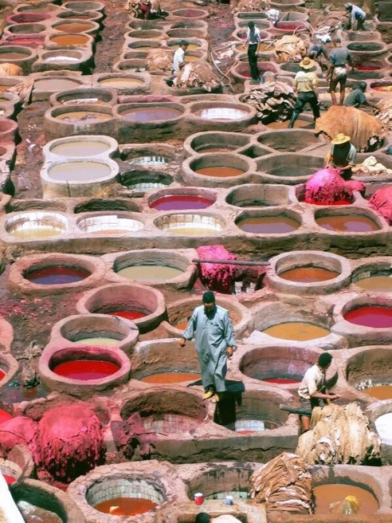 This is an interesting place to see the leather tanning process in Fes, Morocco, but be very careful, some touts would approach you and lead you to their shop and try to sell multiple leather goods for sky-high prices. There are more bag stalls in the souks or better shop in the Marrakech market but try to haggle over the price.