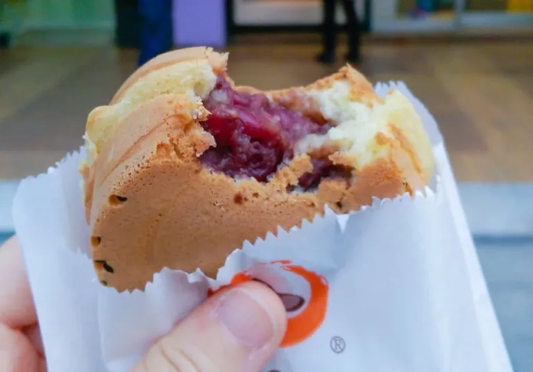 Imagawayaki… sounds like a mouthful and is sure to keep your mouth full. This snack will keep you coming back for more! The batter is cooked in a waffle iron and filled with sweet azuki bean paste. However, you can also choose from a variety of fillings such as vanilla custard, chocolate and matcha (green tea).