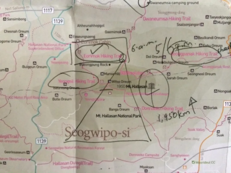 As you can see from the super-tactical (sarcasm, duh) map that my friend and I had drawn, we initially set our sights on Eorimok. But after some chatting with other travellers at our guesthouse who had hiked the mountain a day before, my friend and I decided to go all the way. Seongpanak was our final choice.