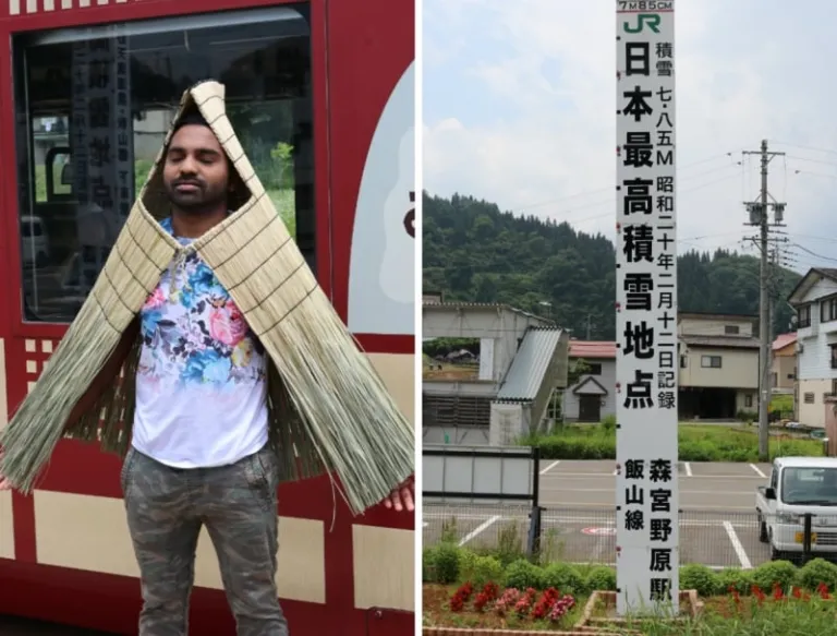 The icing on the cake for this journey, was the stop at Morimiyanohara Station. I saw with my own eyes the place that received the highest snowfall in the history in Japan — can you imagine seven metres of snow?! I was so amazed at that fact! I was also immediately drawn to the opportunity of snapping a photo with an olden-day straw umbrella suit. These ornaments were antique rain protection used in the past before the modern ones that we know now came into existence.