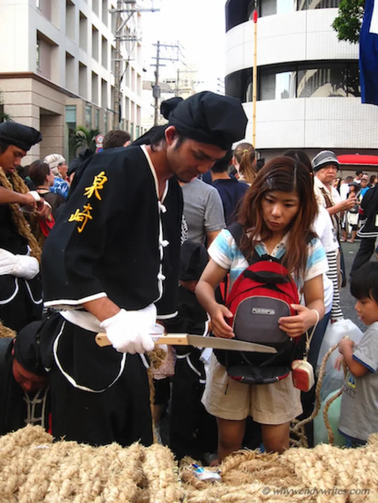 Finally, the battle with the East and West teams begins when the huge paper ball hanging above the middle of the rope bursts open and releases splendid steamers. The rivalry between the East and West is based on the competition between ancient rulers. On each side, “shitaku” or men dressed in costumes like Ryukyuan kings perform and engage in dramatic swordfight above the rope as participants pull the rope vigorously. Most foreign participants are clueless about which team they are pulling for. Ultimately, nobody really cares about the result as the euphoria of cheering and tugging is the most enjoyable part of the experience.