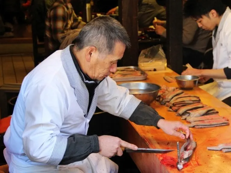 You would have seen parts of the city on the first evening, but it looks completely different in the morning light. Strolling past statues of the 12 animals in the Japanese zodiac, you’ll arrive at a peaceful street lined with humble shops and restaurants. The ambiance here can’t have changed much in the last thousand years. Should you find yourself in need of some comfort food, you’re in luck – the speciality here is unagi (freshwater eel), broiled and served over rice. You can examine the quality of the fish beforehand as master filleters sit by the windows of the best restaurants, preparing the eels in a matter of a few mesmerising seconds.