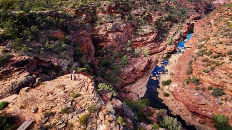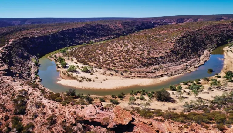 The Z-Bend Lookout offers the most magnificent views of the Murchison River Gorge. Gaze down the 150m vertical drop to view the river coursing below, lined with red river gum trees and flanked by striking Tumblagooda sandstone formations.