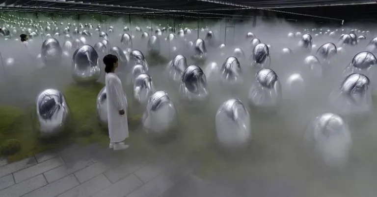 The second installation is called “Moss Garden of Resonating Microcosm – Solidified Light Colors, Sunrise and Sunset.” Visitors will find themselves surrounded by a hazy moss garden where interactive moss houses await. When these houses are pushed back by the wind or a person, they fall and rise, which activates an acoustic domino effect. That means you get to enjoy peaceful and calming sound effects as you walk around the room.