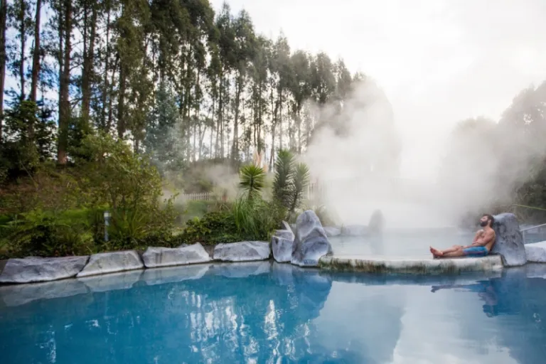 A notable attraction to check out in Taupo is the Wairakei Terraces. These chalky silica terraces are surrounded by bright blue, bubbling pools of water, more evidence of volcanic activity in this region of New Zealand. If you’re still yearning for another geothermal experience, the Wairakei Terraces have pools you can visit for a relaxing soak.