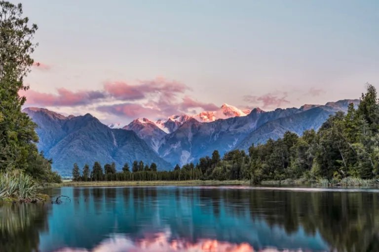 You can also stop by Lake Matheson for the next leg of your New Zealand road trip, a serene lake located nearby Fox Glacier. Natural conditions come together to create the perfect reflective mirror for New Zealand’s highest peaks; Mount Cook, and Mount Tasman. Lake Matheson was formed 14,000 thousand years ago, when Fox Glacier retreated from the sea, and left a depression in the earth that filled with water over time.