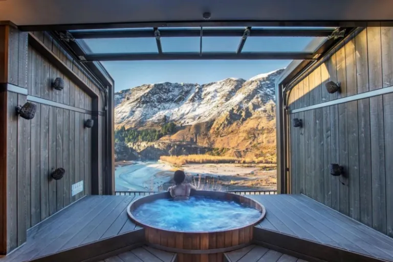 Continue your New Zealand road trip by driving further south to Queenstown. It’s not a very long journey, but you might find yourself stopping pretty often because the views along the way are simply stunning. Upon arrival, your first stop should be the tranquil Onsen Retreat and Day Spa in Arthur’s Point. This incredibly relaxing retreat offers a unique Kiwi twist to the traditional Japanese onsen experience.