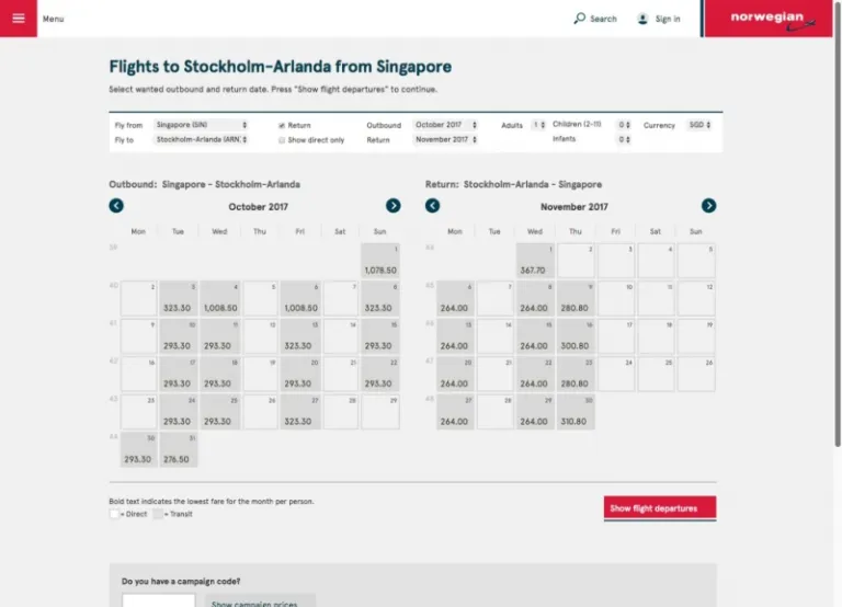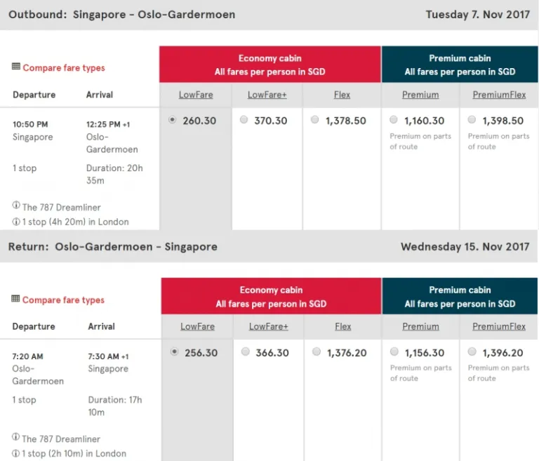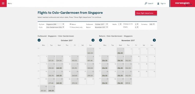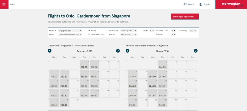 The lowest price for an outbound flight from Singapore to Oslo costs S$260.30, and the lowest price for a flight from Oslo back to Singapore costs S$256.30! That’s a total of S$516.60 for a return trip to Oslo, Norway!