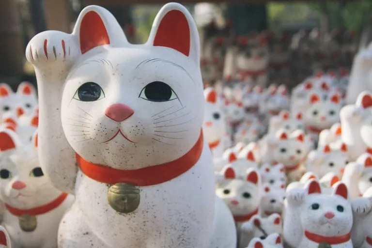 Usually displayed in many shops and restaurants in Japan, the maneki-neko (“beckoning cat”) depicts a cat sitting upright with one raised paw, sometimes moving up and down mechanically, as if inviting you to come closer.