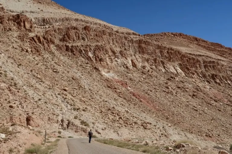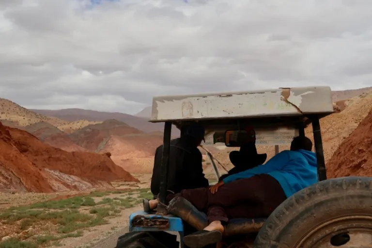 The first steps were pleasant. The cloudy skies and chilly winds were in our favour, but when a tractor rolled up behind us, we couldn’t resist to “cheat” a little bit and hitchhike part of our way to Tighza. We sat at the back of the tractor on loose soil and alongside spades and pickaxes, our legs stretched out in front of us. Mounds after mounds of soil in shades of peach, reddish-orange, and grey came and went.