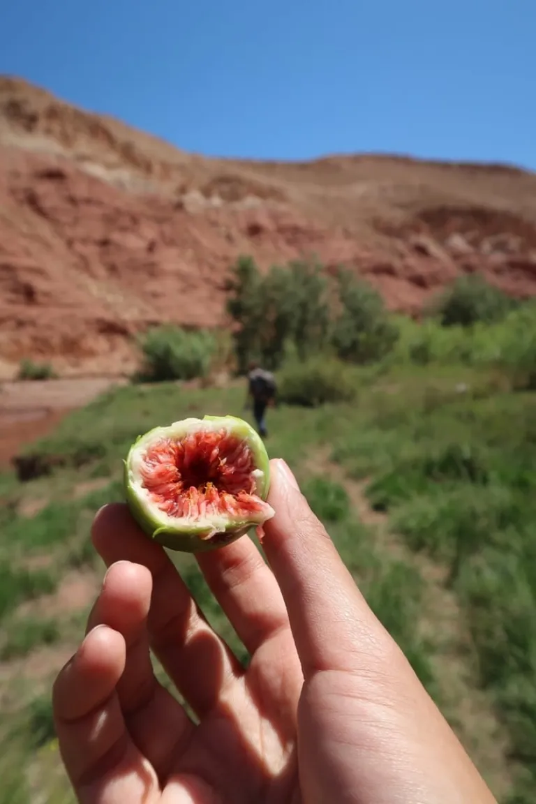 Then we continued our walk. Mostly on the road, but we made a detour to the riverside for a change of pace and scenery. We met a group of giggling, chirpy locals who handed us a handful of figs they had just picked. Soon after, an English-speaking teen sitting on a donkey made his way to us just to say, “Welcome to Morocco”. As the ground by the river was full of shrubs, we improvised walking sticks from tree branches to sweep the way in front of us and check for snakes. The slithering reptiles must have dominated the thoughts of Alex, for he jumped like a kangaroo when a small bush beside his foot was disturbed by a frog. After sharing some laughs, we returned to the comforts of the road.