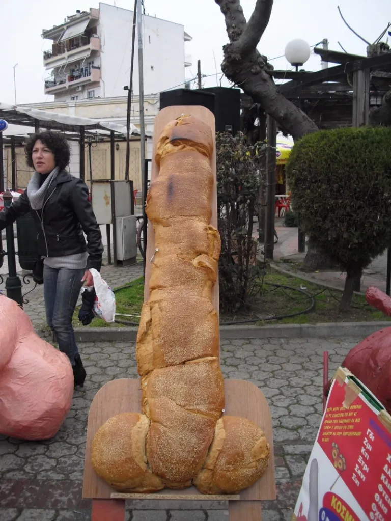 Penis-shaped bread is a common sight in the parade and it’s totally normal to see people swallowing it after dipping it in Bourani soup. This one below is slightly larger than usual of course.
