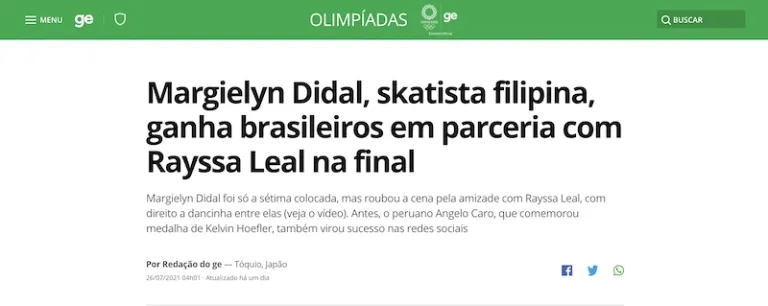 Best of all, Didal even made the headline of the Brazilian news site Globo. The article title translates to “Filipina skateboarder wins Brazilians after partnering with Rayssa Leal in the Olympic final.” Didal may not have won a medal, but she officially won the hearts of Brazilian fans!