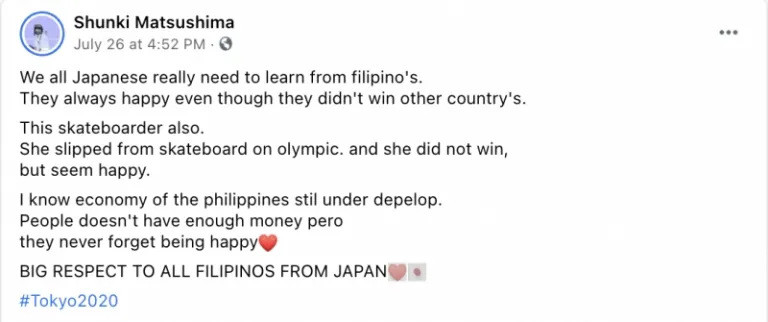 On Facebook, a Japanese fan wrote about how Japanese people could learn from Filipinos’ positivity and attitude towards competitions. Shunki Matsushima praised Margielyn Didal for being happy even though she didn’t win. In all caps, she wrote “Big respect to all Filipinos from Japan❤️🇯🇵.” The post has gained almost 40,000 shares as of writing.