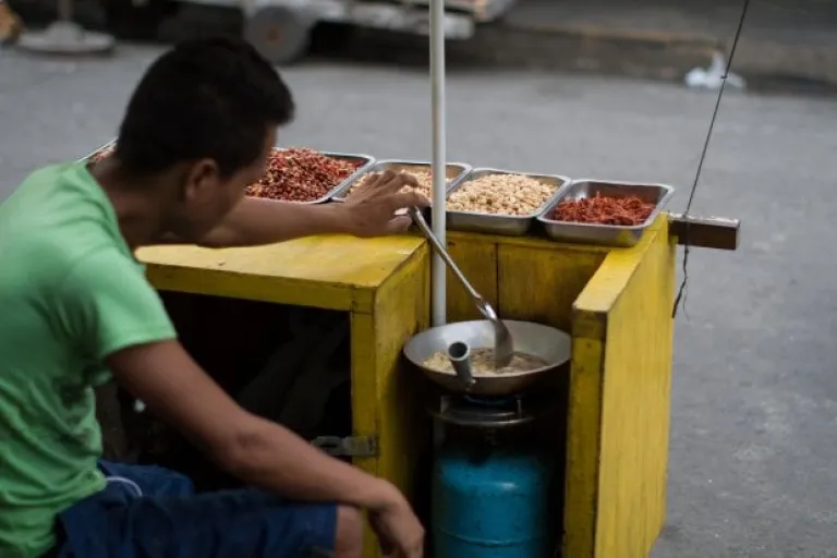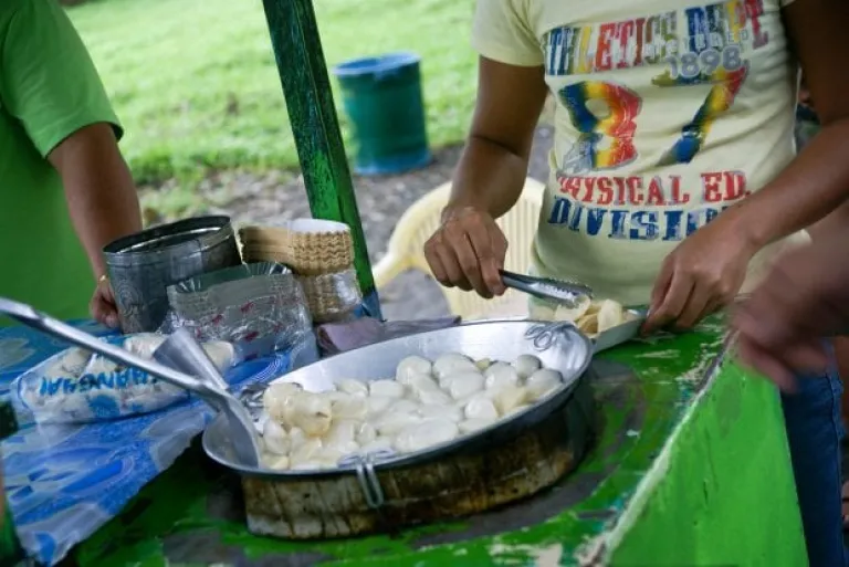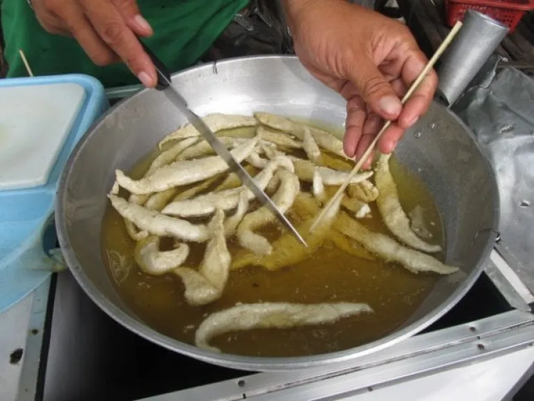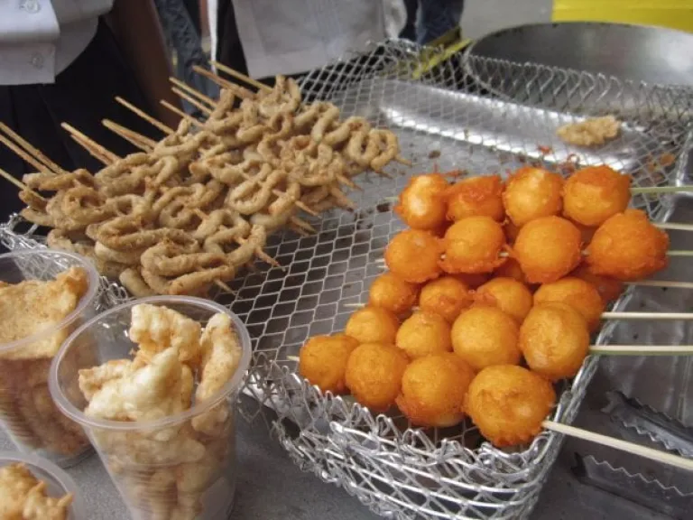 This snack is round, fish-flavoured dough that is deep-fried in a wok. Vendors usually spear the balls using barbecue sticks then dip them into flavourful sauces: sweet, spicy or a mix of both.