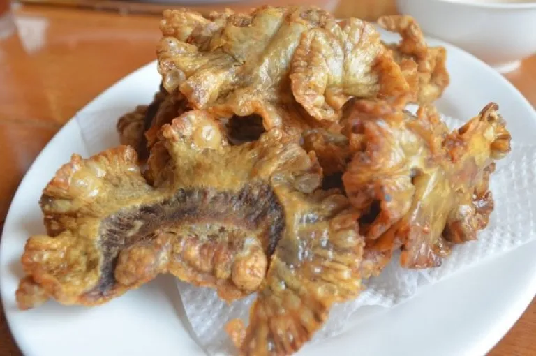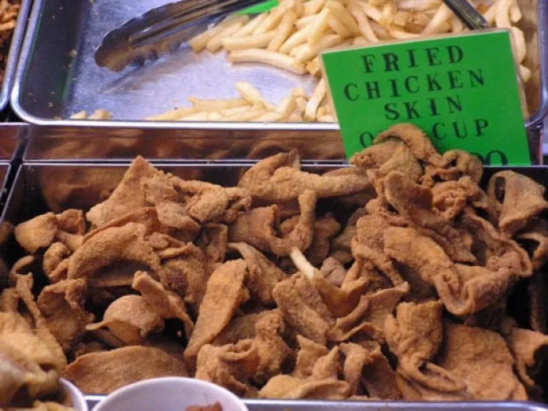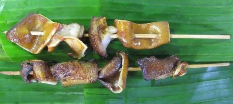Oozing with calories, deep-fried chicken skin is one of the roadside guilty pleasures. Filipinos call this snack “chinks”, not to be confused by the Spanish-originated snack of fried pork skin that is widely-known as “Chicharron”.