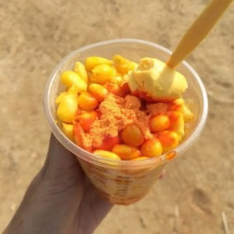 Boiled sweet corn is seasoned with salt, margarine or butter. Some serve it on cob; others serve it in cups filled with corn kernels mixed with cheese powder and butter.
