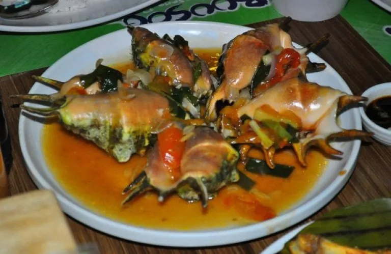 Seafood lovers tend to be addicted to these shells. Also known as “conch”, vendors cook the shells by boiling it with water. They use hammer to crack the conch and get its meat. Then they slice it to bite-size and skewer it with a stick. The meat is sweet, juicy and tender when dipped with a glass of spiced vinegar.