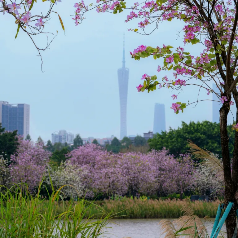In the "Flower City" of Guangzhou, the Bauhinia variegata (Orchid Tree) is the star. At Haizhu Wetland, thousands of these trees line the 3.2km Shiliugang River, creating a tunnel of pink and white.
