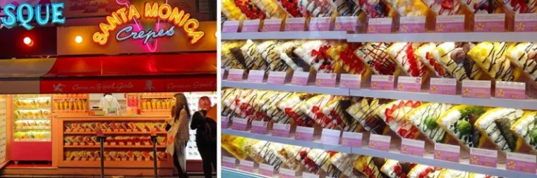 Santa Monica Crepes is another icon amongst the crowd of Harajuku’s crepe stalls. With two stalls dotting Takeshita Street, this vibrant shop serves up dozens of sweet and savoury crêpes daily. When you chance upon their California-style diner shops, be spoilt for choice as you stare bug-eyed at the fake display of their army of crêpe selections!