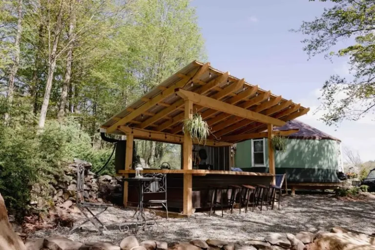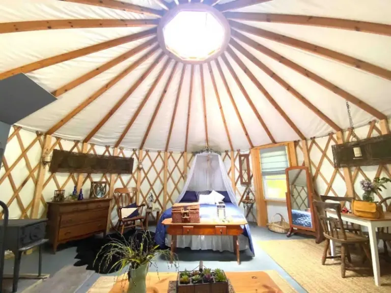 Perched on a grassy knoll on a 40-acre farm, this charming yurt will make you feel a million miles away from regular city life. The off-grid nature of this Poconos Airbnb definitely delivers a unique vacation experience! While it’s comfortable with surprisingly roomy interiors, a queen-size bed, and an outdoor bar-slash-kitchen, the rental has no running water and limited solar energy. So, make sure you pack a flashlight!