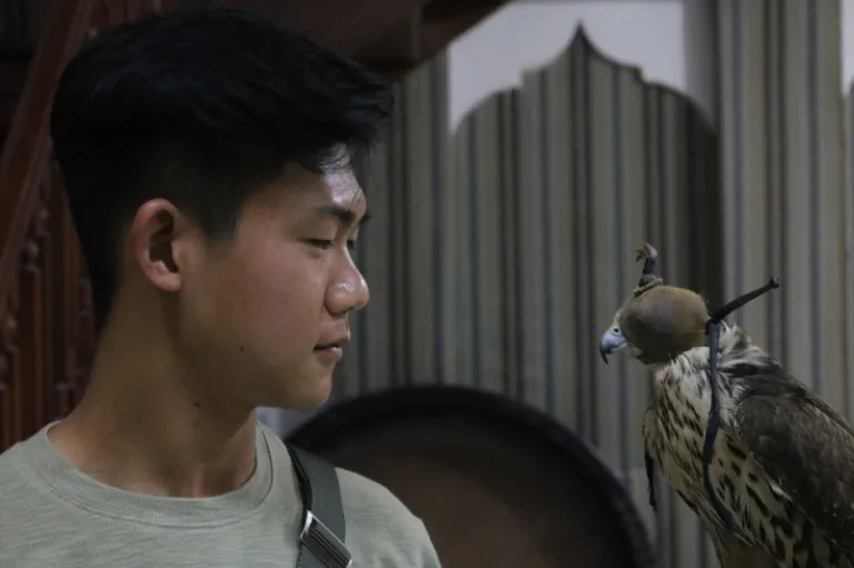 Walking into one shop, I observed the cast of falcons perched on wooden bird stands in a sandbox in the middle of the room, eyes capped and oblivious to fanfare they were garnering.