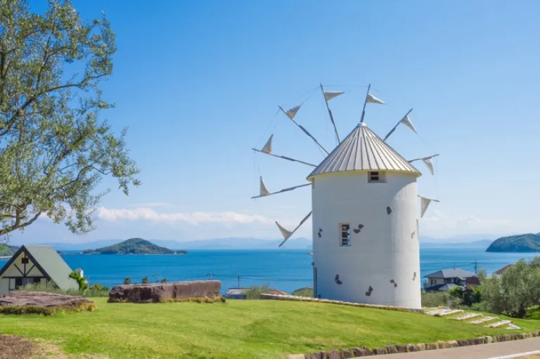 The scent of olives and this whitewashed Greek-style windmill add to the Mediterranean vibe of Shodoshima.