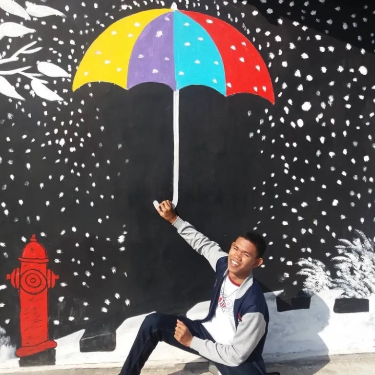 Other than vibrant buildings and multi-coloured flags, you’ll also find creative and quirky murals all around the village. From human-sized angel wings and pastel-coloured balloons to flashy umbrellas and scary dinosaurs, the walls are plastered with a multitude of adorable illustrations.
