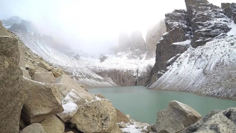 This spectacular view is the prize for four days of hiking and sore legs. Here, the three towers were obscured by the thick morning fog. Should you embark on this trip, keep your fingers crossed because in Torres del Paine National Park, the weather is ever-changing.