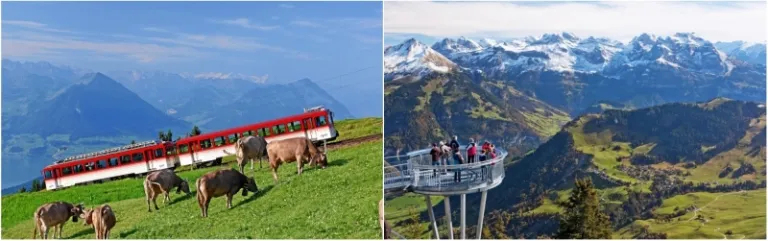 The cogwheel rail up Mt Rigi, included in the Swiss Travel Pass (left) & Stanserhorn Observation Deck (right) | Image credit: Switzerland Tourism