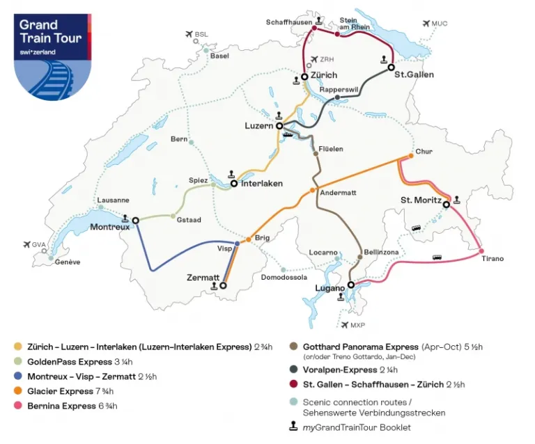 The Grand Train Tour of Switzerland offers the perfect way to explore the country’s diverse landscapes, all from the comfort of the world’s most scenic trains. Use the GTToS map to plan your journey and experience Switzerland like never before. With the Swiss Travel Pass (STP) 1st Class, you’ll enjoy unlimited travel in first class on these premium panoramic trains, with extra travel days added for free! Just be sure to book your seat in advance, as seat reservations and fees apply.