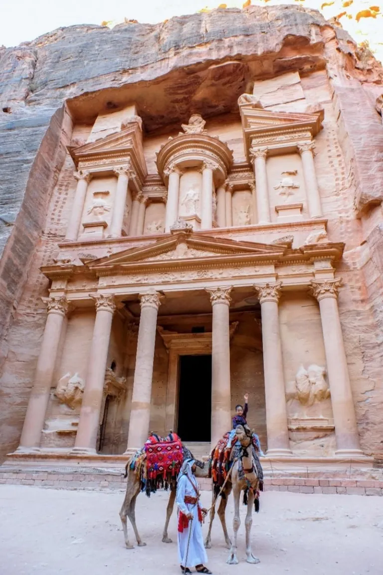 The grand facade of The Treasury dwarfs the camels and my friend’s son. | Image credit: Al Cubacub.
