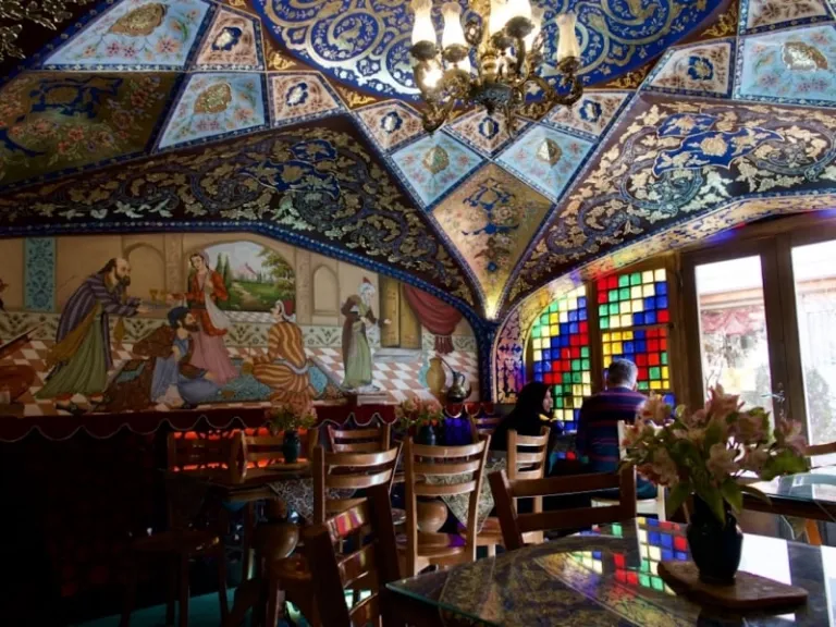 Quite possibly the most Instagram-worthy cafe in Isfahan, near the Vank Cathedral features a striking traditional design. Most noticeably, the cosy little space is encapsulated under an intricate blue and gold ceiling that’s topped with a chandelier. Other than a wide range of shakes and teas, they also serve food like sweet Armenian bread and ash, a green noodle soup with beans and herbs.