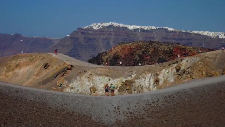 You would expect the views from the caldera to be absolutely incredible based on this picture. The contrast between the crystalline waters and the reddish-brown jagged contours of the rocks are captivating. This vantage point gives you a panoramic perspective of natural Greek beauty.