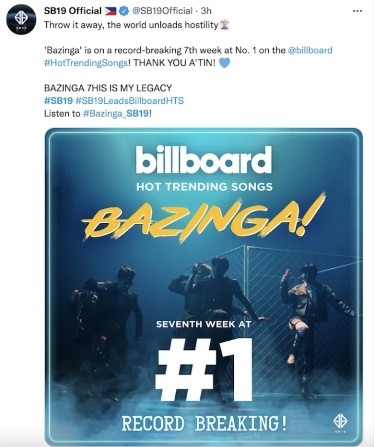 Indeed, it seemed like SB19’s Filipino fans broke Twitter with the amount of tweets coming in for the tracking week of 15 to 22 Jan 2022. Last Friday, the Billboard HTS chart actually froze when Bazinga was only at 8.4 million tweets, second to Butter. But after Billboard made the final tally, Bazinga came out the victor with a whopping 9.3 million tweets for the week. This, of course, was achieved with a little help from SB19’s growing international fan bases.