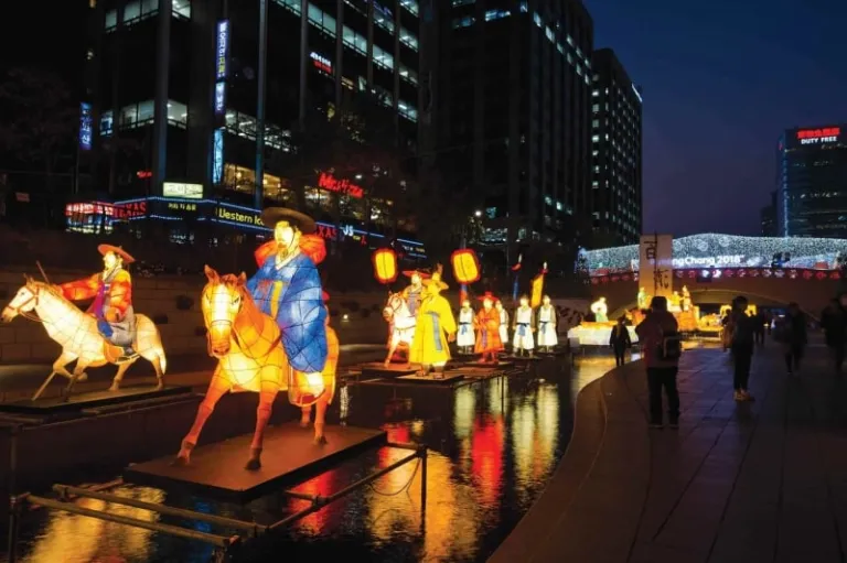 Another spectacular nighttime activity to add to your fall-in-Seoul experience would be witnessing the glimmering lanterns in Cheonggyecheon Plaza. In November, the Seoul Lantern Festival often features colourful hanji lanterns in all shapes and sizes, lining 1.2 kilometres along the Cheonggyecheon stream. What a way to elevate your experience of Seoul in the fall this year!
