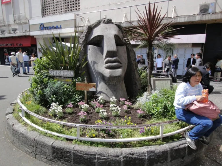 Located on the southwest side of Shibuya station, the Moyai statue is a grey statue of a huge head surrounded by a bed of bright small flowers. Bearing an uncanny resemblance to the Easter Island Moai statue, the Moyai statue was donated to Shibuya by the people of Niijima in 1980.