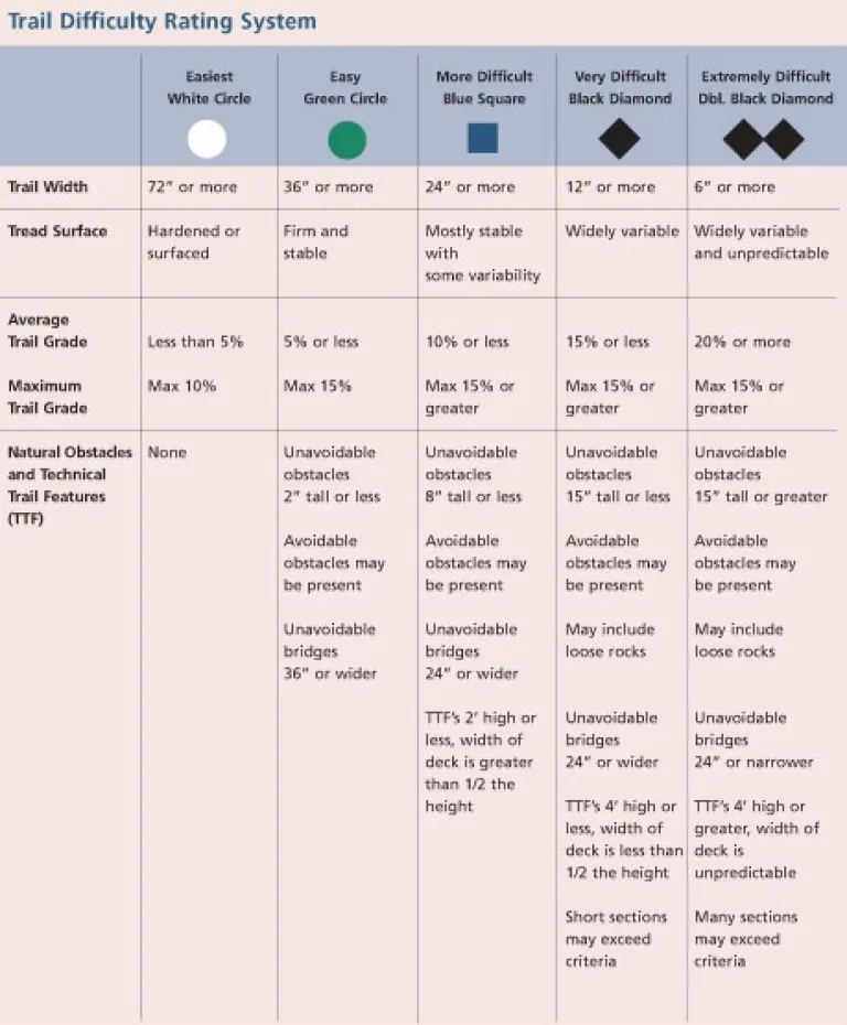 We will attempt to give each trail a realistic rating based on the IMBA Trail Difficulty Rating System for the 5 trails listed.