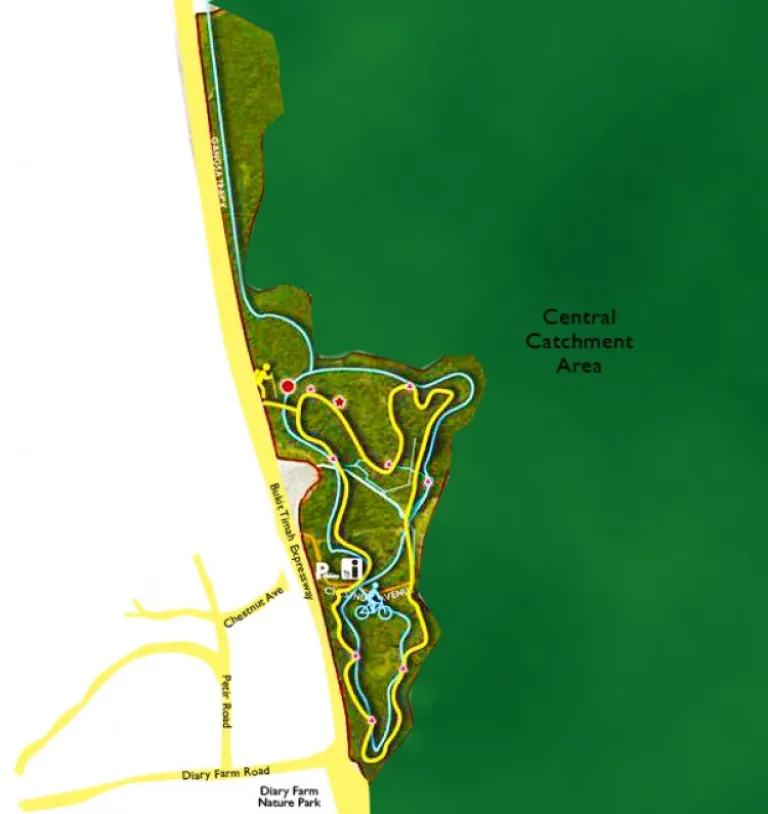 Stretched between Hinhinde Park and Diary Farm Road, this is a mountain bike loop which circles around the Bukit Timah Hill. Visitors can enter the trail from either entrances.