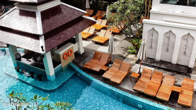 The swimming pool is the highlight of the hotel. There are always people relaxing on the deck chairs to great music and sunshine. There is a small island in middle of the pool with a single palm tree and a basketball attached to its trunk. Kids and adults play with balls in the pools or busy themselves with the water slide. The pool bar lets you swim right up to it and order a drink from the friendly bar tender. The jacuzzi on the right edge of the pool puts out strong jets of water to give you a full body massage. Thursday is BBQ night where the staff cooks up a yummy grilled burger (chicken or beef) accompanied with fruits and beer for you to enjoy by the pool. All these for THB 300/ SGD 12. I shared a plate with Ellis after a swim and we were both delighted by the tender chicken patty.