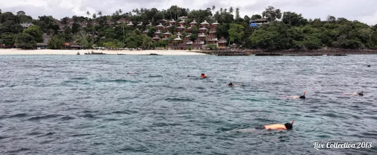 My tour guide, in his thai-accent English, is a funny man. He repeats every phrase and sentence twice, “We will be going to Phi Phi Ley next… going to Phi Phi Ley…” If you miss a word or two from the roar of the engine or waves, you can always catch his replay. His concern for your safety can be felt by his imaginary morbid endings (should you not heed his warnings). Then there is his constant screaming of “Sit down! All of you sit down now!” to keep order on the boat, which is necessary when you have thirty people crammed on a small boat.