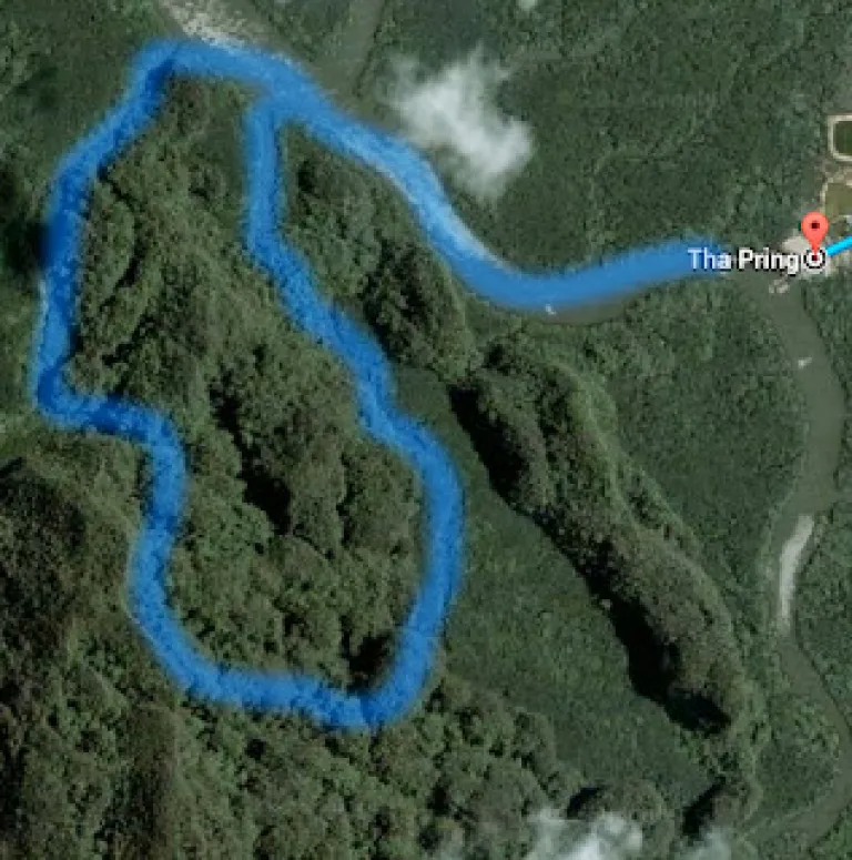 I tried to map out the route that I took during the kayaking trip on Google map. After switching to satellite view, it is still difficult to make the stream of water through the vegetation. See the thick foliage and tiny stream of water in the photo. I have marked the route in blue based on my memory and hints of vegetation outline on the map.